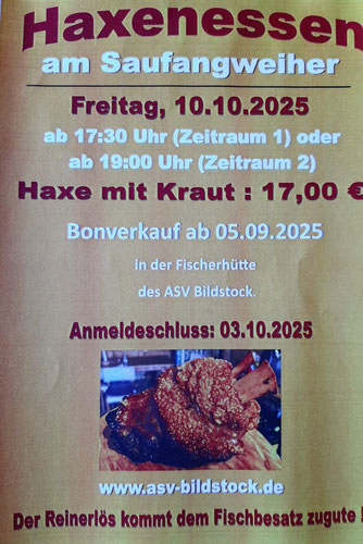 Der ASV Saufang Bildstock e.V. ist ein gemeinnütziger Angelverein. Die Anglerkameraden sind in einer Altersgruppe von 9 bis 90 Jahren und kommen aus allen beruflichen Schichten. Hauptziel der Mitglieder ist seit über vierzig Jahren der Erhalt und der Ausbau des Landschaftschutz- und Naherholungsgebiet Saufangweiher. Hierzu verpflichtet sich jedes Mitglied, jährlich 12 Arbeitsstunden, am Saufangweiher zu leisten. Neben dem Arbeiten geht es natürlich auch um den Angelsport. Vereinsintern findet neben dem jährlichen Königsfischen auch Tandemfischen und viele weitere Aktivitäten rund um den Angelsport statt. Das Weiherfest ist der Höhepunkt des Vereinsjahres, bei dem alle Mitglieder immer wieder ehrenamtlich helfen, damit das Fest stattfinden kann. Bei Vereinsveranstaltungen ist das Fischen, auch wenn man für einen anderen Verein fischt, per Vereinsordnung untersagt.